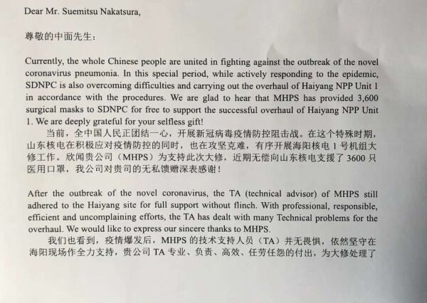 守望相助、同舟共濟。在國內(nèi)疫情防控形勢艱難的時刻,國家電投山東核電收到了來自國際的真誠幫助和支持。日本三菱日立電力系統(tǒng)株式會社輾轉多方協(xié)調到3600枚口罩,并在中日航運物流出現(xiàn)大面積滯壓的情況下,積極協(xié)調敦豪國際快遞東京總部,通過防疫物資捐贈綠色通道以最快速度運抵海陽核電現(xiàn)場,同時還派出技術人員到海陽核電現(xiàn)場支持1、2號機組首次換料大修工作。美國西屋公司也送來了398枚N95口罩。