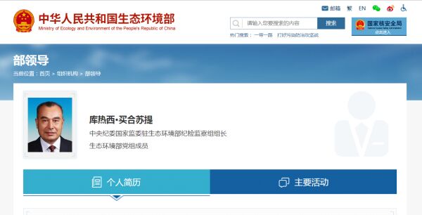 據(jù)生態(tài)環(huán)境部官網(wǎng)“部領(lǐng)導(dǎo)”欄目信息,庫熱西·買合蘇提已于今年5月出任中央紀(jì)委國家監(jiān)委駐生態(tài)環(huán)境部紀(jì)檢監(jiān)察組組長、生態(tài)環(huán)境部黨組成員,他此前擔(dān)任自然資源部副部長、黨組成員,兼任國家自然資源副總督察。