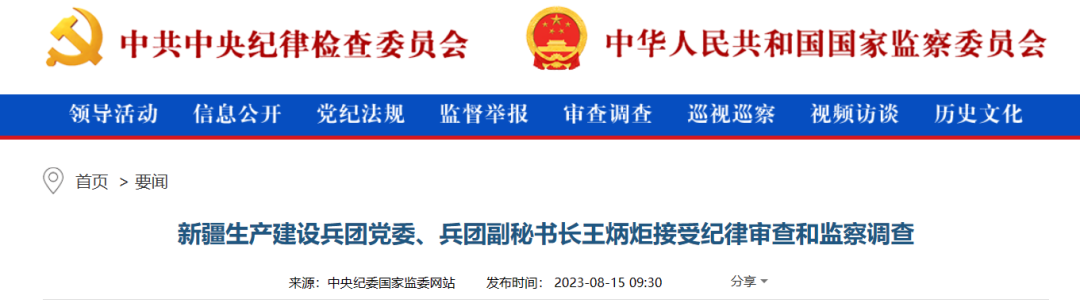 中央紀(jì)委國(guó)家監(jiān)委網(wǎng)站8月15日消息,據(jù)新疆生產(chǎn)建設(shè)兵團(tuán)紀(jì)委監(jiān)委消息:新疆生產(chǎn)建設(shè)兵團(tuán)黨委、兵團(tuán)副秘書長(zhǎng)王炳炬涉嫌嚴(yán)重違紀(jì)違法,目前正接受新疆生產(chǎn)建設(shè)兵團(tuán)紀(jì)委監(jiān)委紀(jì)律審查和監(jiān)察調(diào)查。