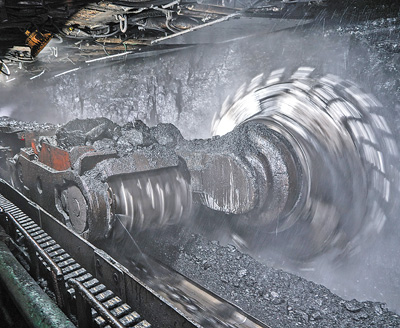 開采 內(nèi)蒙古自治區(qū)鄂爾多斯市 布爾臺煤礦綜采工作面,機器在開足馬力生產(chǎn)。