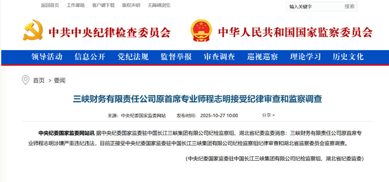 10月27日,中央紀(jì)委國家監(jiān)委網(wǎng)站信息顯示,據(jù)中央紀(jì)委國家監(jiān)委駐中國長江三峽集團(tuán)有限公司紀(jì)檢監(jiān)察組、湖北省紀(jì)委監(jiān)委消息:三峽財務(wù)有限責(zé)任公司原首席專業(yè)師程志明涉嫌嚴(yán)重違紀(jì)違法,目前正接受中央紀(jì)委國家監(jiān)委駐中國長江三峽集團(tuán)有限公司紀(jì)檢監(jiān)察組紀(jì)律審查和湖北省監(jiān)察委員會監(jiān)察調(diào)查。